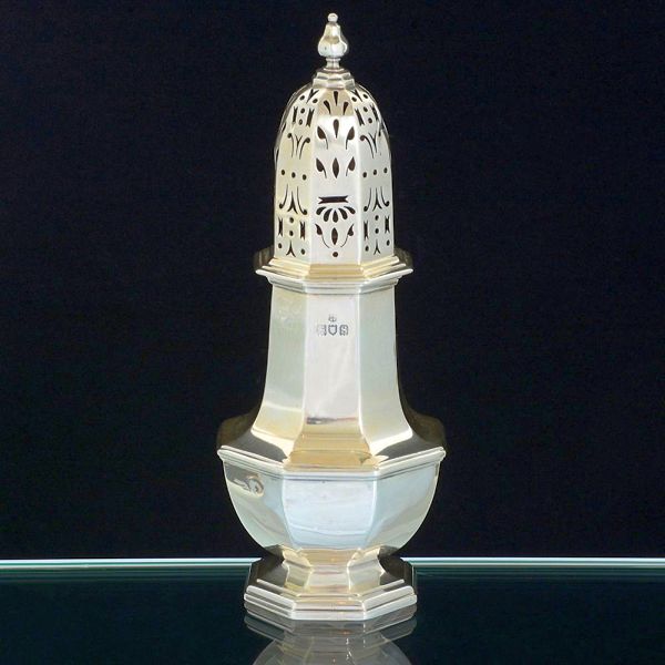 • <b>Polvilhador </b>em prata inglesa lisa e chanfrada. Pega em forma de pinha. Contraste da cidade de Londres 1913 e marca do prateiro HENRY VANDER & ARTHUR VANDER. Alt. 22 cm. Peso 345 gramas.