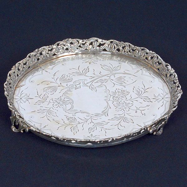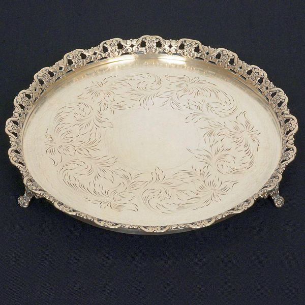 • <b>Salva </b>circular em prata apresentando fundo lavrado e aba em vazados floridos. triplos pés em garras. Aparentemente sem marcas. Diâm. 25 cm. Peso 445 gramas.
