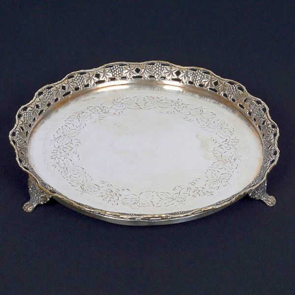 • <b>Salva </b>circular em prata, apresentando fundo gravado com folhas e cachos de uvas. Borda recortada vazada com os mesmos motivos. Pés em garras. Diâm. 22 cm