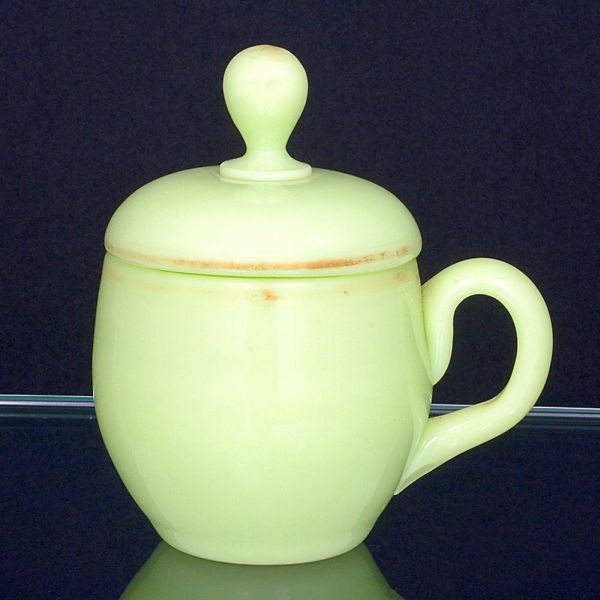 • <b>Xícara com tampa </b>em opalina francesa verde claro apresentando forma bojuda com alça recurvada. Séc. XIX. Alt. 13,5 cm; Compr. 13 cm