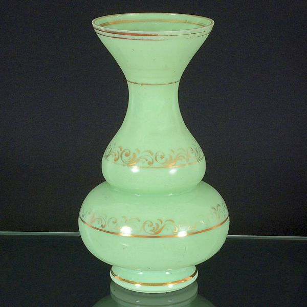 • <b>Vaso </b>em opalina francesa verde claro na forma de bulbo, com bocal aberto. Estilizações e frisos a ouro. Séc. XIX. Alt. 31 cm