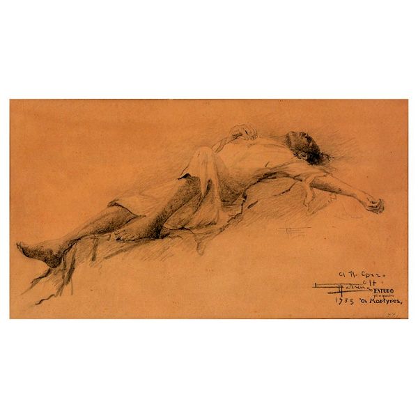 • <b>PARREIRAS, ANTÔNIO</b><BR>(1860-1937)<BR>Figura<BR>Estudo para o quadro "Os Martyres"<BR>Ass. e datado 1927, no centro<BR>33 x 59 cm