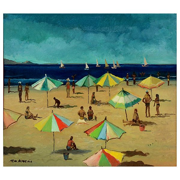 • <b>R. M. ALMEIDA</b><BR>Personagens na Praia<BR>Óleo s/ tela<BR>Ass. cie<BR>38 x 46 cm
