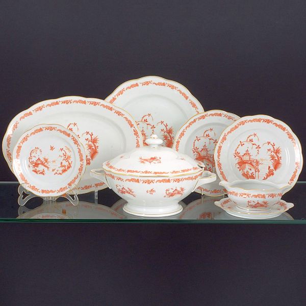• <b>Serviço de jantar </b>em porcelana polonesa "KPM". Decoração em "chinoiserie" "rouge de fer" sobre fundo branco. Constando de 24 pratos rasos (24 cm), 7 pratos de sopa, 9 pratos de sobremesa, 1 sopeira (compr. s/ as alças 32 cm), 1 legumeira redonda, 1 "bowl" redondo, 2 "bowls" quadrados, 1 travessa circular (32 cm), 4 travessas ovais (compr. da maior 38 cm), 1 covilhete oval e 1 molheira. Total de 52 peças.