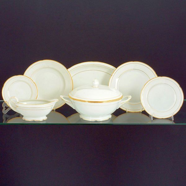 • <b>Serviço de jantar </b>em porcelana polonesa com decoração clássica de frisos a ouro e gominhos nas bordas. Punção da manufatura no verso. Constando de 16 pratos rasos, 4 pratos fundos, 12 pratos de sobremesa, 9 pratos p/ pão, 1 sopeira circular, 2 "bowls" circulares, 3 travessas ovaladas e 1 molheira. Punção do fabricante no verso. Total de 48 peças.