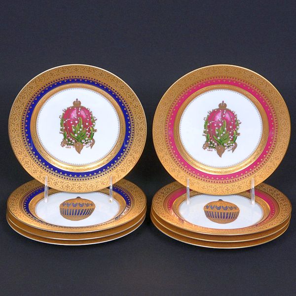 • Raro e elegante <b>conjunto de 8 pratos </b>de jantar em porcelana Fine China, Fabergé. Cada peça decorada com representação distinta de ovos imperiais da Casa Fabergé, em cores intensas e riquíssimos detalhes em ouro. Bordas com ampla faixa em ouro adamascado, com aplicações em azul, vermelho e rosa, formando um conjunto harmonioso e luxuoso.