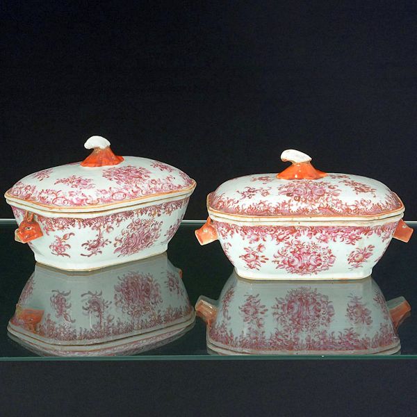 • <b>Par de terrinas para molho </b>em porcelana Companhia das Índias decorada em esmaltes da Família Rosa com composições floridas em fúcsia sobre fundo branco. Pegas do bojo em "rouge de fer" modeladas em cabeças de lebres e da tampa em folhagens. Séc. XVIII. Acompanha selo da Sothebys de 8/11/94, lote 261.