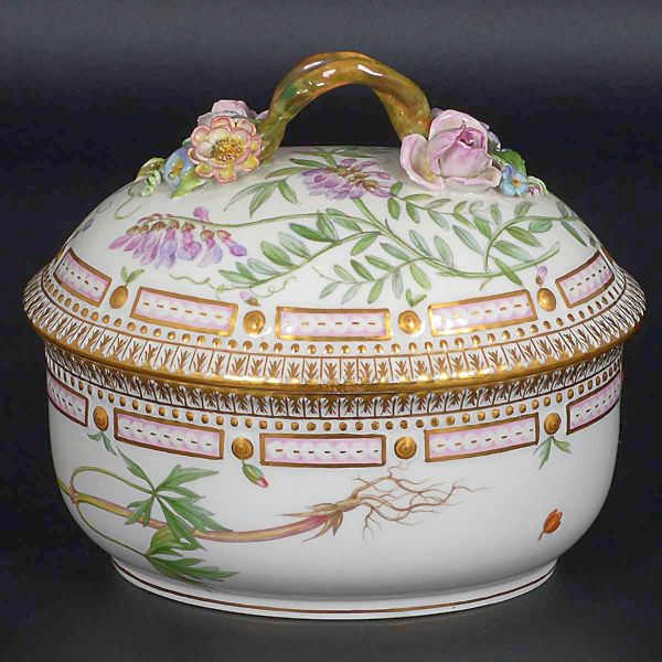 • <b>"Bombonnière" com tampa </b>em porcelana dinamarquesa da importante manufatura Royal Copenhagen modelo "Flora Danica". Peça inteiramente pintada à mão em belíssima policromia com suas designações botânicas e numeração no verso. Apresenta borda em mínimos picotados cobertos a folha de ouro. Compr. 15,5 cm