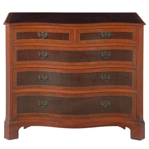 • <b>Cômoda </b>inglesa construída em mogno e rádica em elegante contraste. Caixa retangular com frente em ondulações apresentando duas gavetas lado a lado sobre três gavetões. Decoração em discretos filetados e ilhargas frisadas em baixo relevo com pés em arcada e puxadores metálicos. Med. 91 x 107 x 49 cm