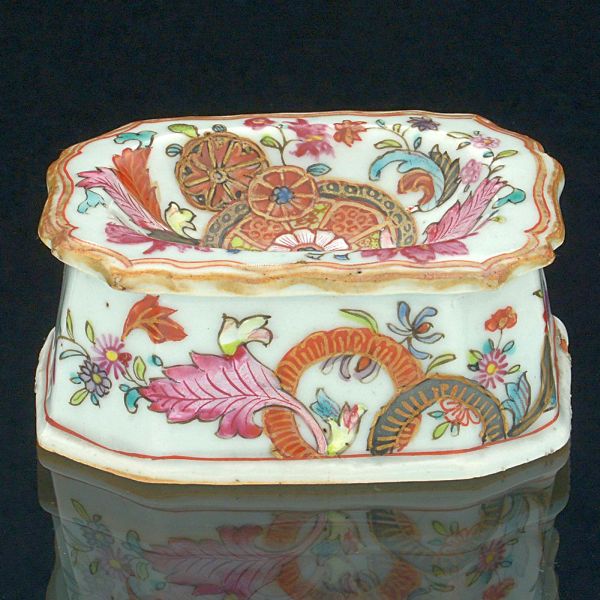 • <b>Saleiro </b>de forma retangular com parte superior funda e borda recortada em porcelana Companhia das Índias em policromia nos esmaltes da Família Rosa numa variação do padrão "Folha de Tabaco", conhecida com "Folha de Chá". Séc. XVIII. Med. 8 x 6 x 3,5 cm