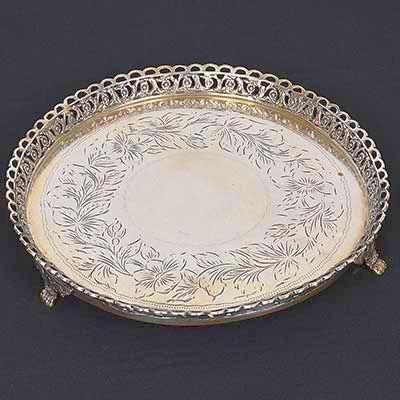 • <b>Salva </b>circular em prata portuguesa. Fundo lavrado com flores e borda com flores, volutas e semicírculos. Pés em garras ladeadas por volutas. Marca da cidade do Porto e de prateiro. Diâm. 25,5 cm. Peso 550 gramas.