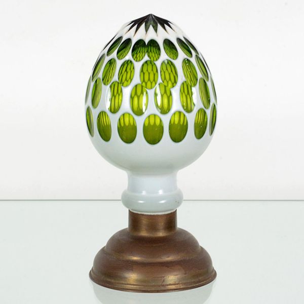 • <b>Pinha </b>em cristal, ornamentada em "overlay" verde translúcido, trabalhada com sucessivas aberturas ovais que revelam o tom interno. Corpo de forma arredondada, apoiado sobre base em latão envelhecido. Alt. 22 cm