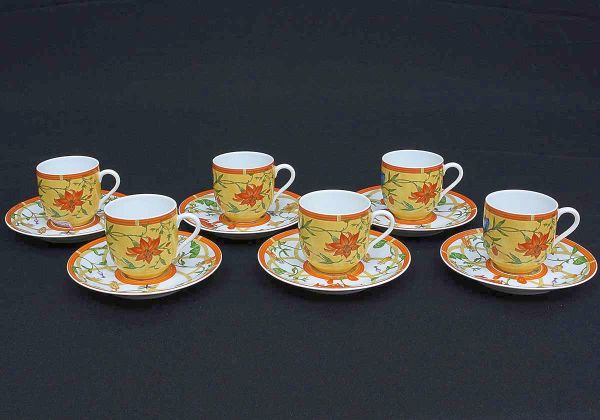 • MAISON HERMÈS - Paris. <b>Conjunto de 6 xícaras para café com seus pires </b>em porcelana policromada, modelo "La Siesta".
