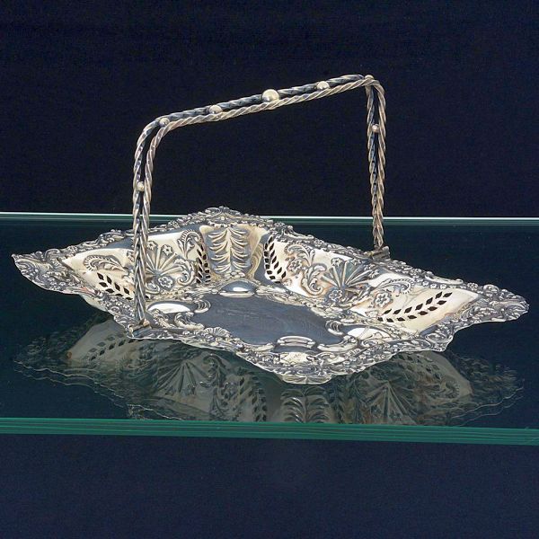 • <b>Cesta para correspondência </b>em prata inglesa profusamente decorada com flores, folhagens, "coquilles" e vazados. Alça retorcida com elementos esféricos. Contraste da cidade de Birmingham de 1903 e marca do prateiro W. D. Med. 29 x 21,5 cm. Peso 450 gramas.