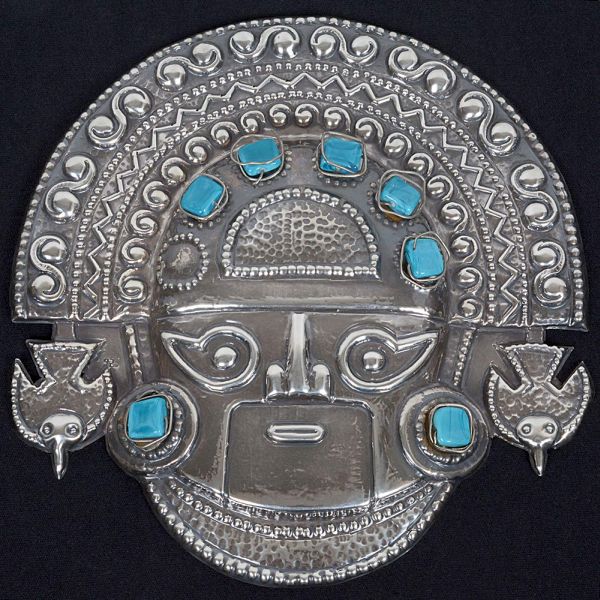 • <b>Máscara decorativa </b>em prata teor 925 ml, com rica gravação geométrica, motivos de aves estilizadas nas laterais e elementos simbólicos em relevo. Apresenta aplicações de pedra em tom turquesa. Med. 18 x 18 cm