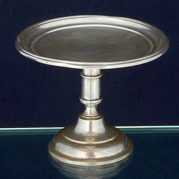 • Pequena<b> molheira </b>em prata lisa apresentando prato circular destacável de sua base. Haste cilíndrica e sua base abobadada. Marcas de prateiro parcialmente ilegíveis. Alt. 11,5; Diâm. 14,5 cm. Peso 230 gramas.