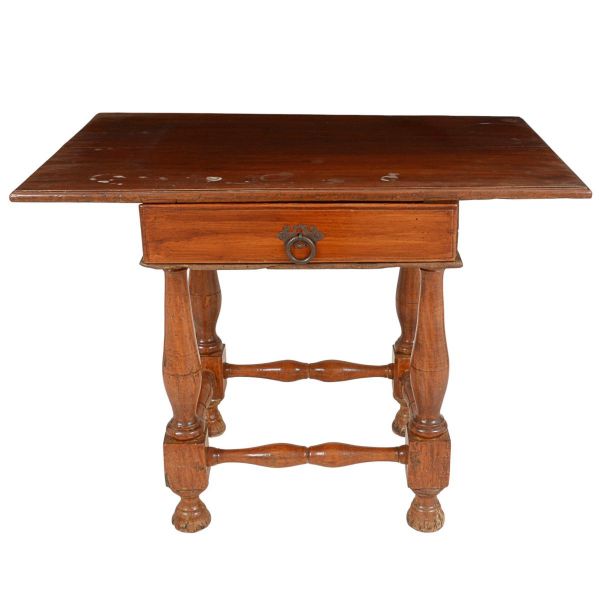 • Bela e boa <b>mesa de aparato </b>europeia em madeira nobre, apresentando tampo retangular sobre gaveta anterior com puxador em cubos unidos por travessões inferiores. Pés cônicos. Med. 91 x 120 x 78 cm