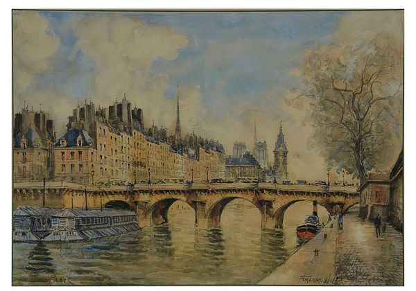• <b>FRANK-WILL </b><BR>(1900-1951)<BR>Escola Francesa<BR>Vista do rio Sena com a Île de la Cité<BR>Década de 1930<BR>Aquarela sobre papel<BR>Assinada e localizada Paris, cie<BR>33 x 46,50 cm