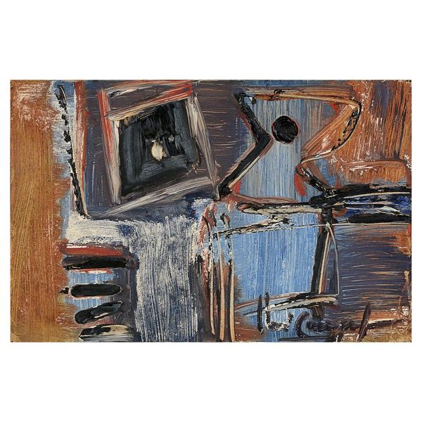 • <b>IBERÊ CAMARGO</b><br>(1914-1994)<br>Abstração<br>Óleo s/ chapa industrializada<br>Ass., cid e verso<br>Apresenta no verso selo da Villa Bernini Objetos de Arte<br>16 x 22 cm