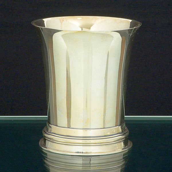 • Robusto <b>copo </b>em prata inglesa levemente cônico com base em frisos. Contrastes atuais da cidade de Londres e marca do prateiro ROBERT CARR. Alt. 12,5 cm