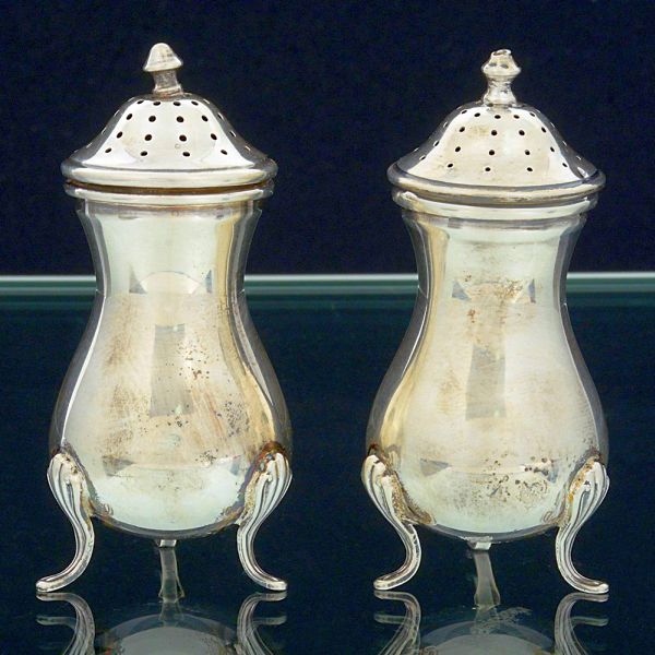 • <b>Par de saleiros </b>piriformes em prata Sterling peruana 925 ml lisa com pés revirados para fora. Prateiro CAMUSSO. Alt. 9,5 cm. Peso 145 gramas.