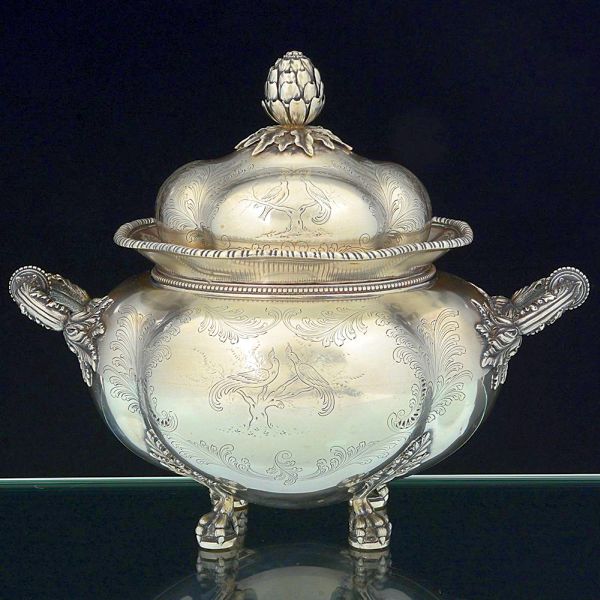 • <b>Sopeira globular </b>bojuda em prata portuguesa, apresentando gravação com figuras de aves pousadas em árvores e elementos vegetais. Pega da tampa modelada em pinha e alças em belo repuxado de folhas com detalhe perolado. Pés em garras. Contraste da cidade do Porto usado a partir de 1938 e teor 833 ml. Compr. sem as alças 29 cm; Alt. 24 cm. Peso 1595 gramas.