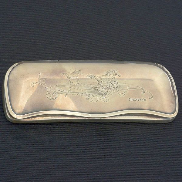 • TIFFANY & Cº - Invulgar<b> caixa para óculos </b>em prata Sterling americana apresentando forma levemente movimentada com tampa decorada por dois cavalos galopantes. Inscrições Inc. P. Cortini - Botega C. Giovanelli e de Tiffany & Cº. Interior aveludado. Compr. 16 cm. Peso 170 gramas.