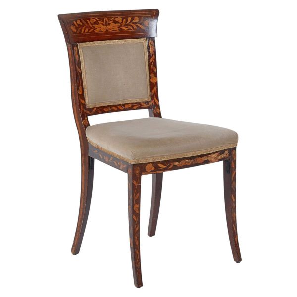 • <b>Cadeira</b> singela, holandesa, em madeira nobre decorada em "marqueterie" florida em tonalidade mais clara. Assento e centro do espaldar forrados em veludo bege. Frente da aba descascada e lateral esquerda do cachaço colada. Séc. XIX. Alt. 87 cm