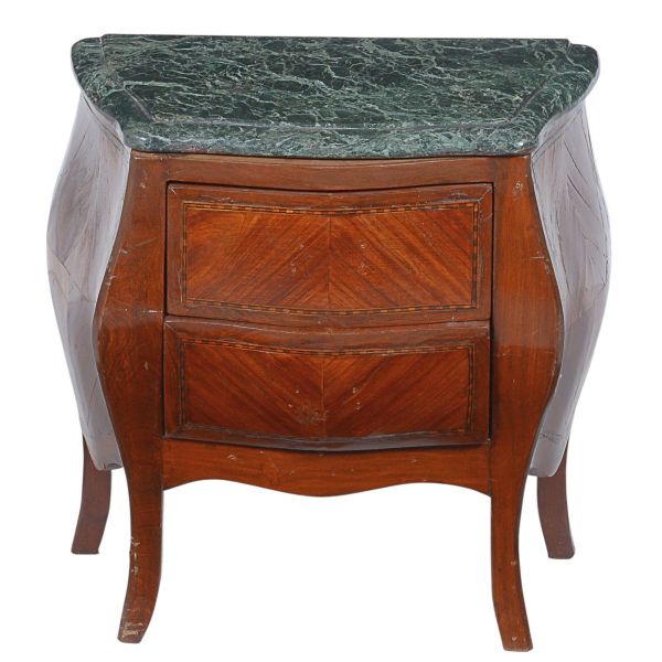 • Pequena <b>cômoda </b>francesa em "rosewood", apresentando estrutura "bombée" com duas gavetas anteriores e pernas levemente recurvas. Decoração com filetados de dois tons nas bordas. Tampo em mármore verde Alpi. Med. 41 x 39 x 23 cm