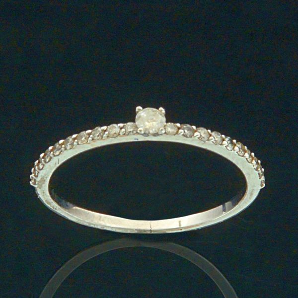 • <b>Anel </b>solitário em base de aliança montado em ouro branco 18k com 21 brilhantes, sendo um diamante no centro com o peso aproximado de 0,6 ct e 20 brilhantes menores com o peso aproximado de 0,20 ct. Peso da peça 1,24 gramas.