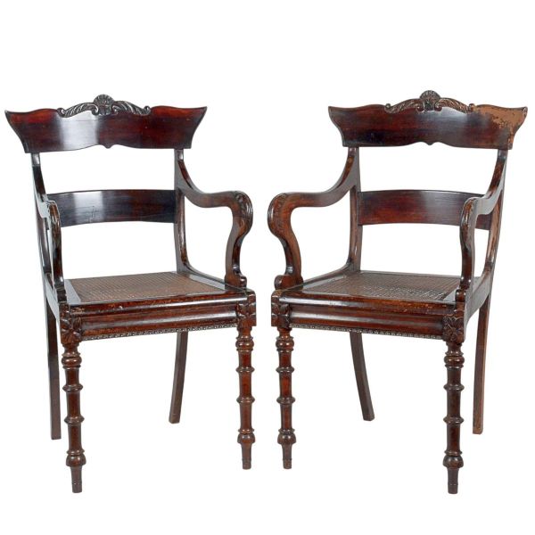 • <b>Par de cadeiras de braços </b>em madeira escura entalhada, encostos levemente curvos com friso superior recortado e ornado ao centro, braços em voluta, assentos em palhinha e pernas torneadas com anéis sucessivos. Alt. 97 cm