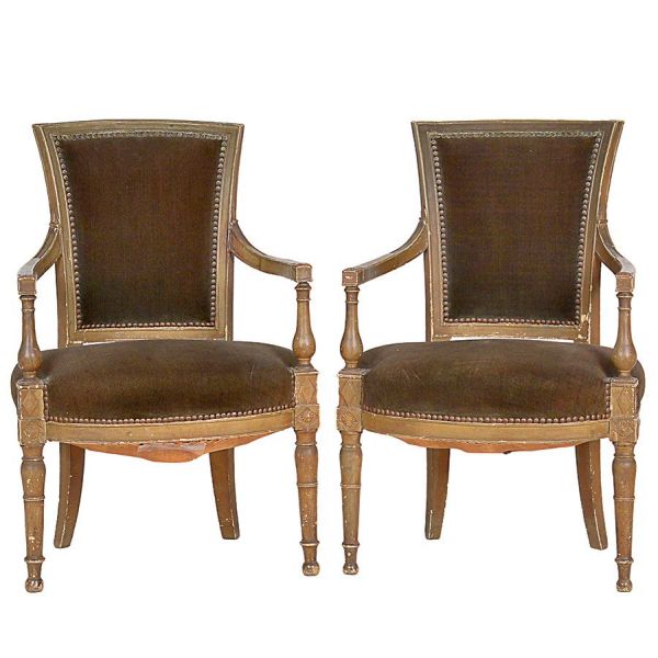 • <b>Par de antigas cadeiras </b>com estrutura em madeira patinada, de tonalidade verde acinzentado, e linhas levemente recurvadas. Pernas anteriores cilíndricas e retas. Estofamento em veludo marrom. Alt. 87 cm