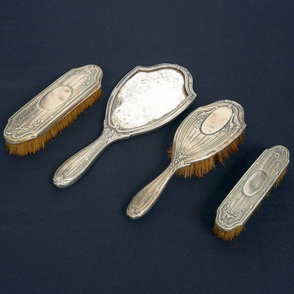 • <b>Conjunto de 3 escovas e 1 espelho </b>de "toilette" em alpaca com decoração de frisos e guilhochadas. Apresenta mossas. Compr. do espelho 29 cm