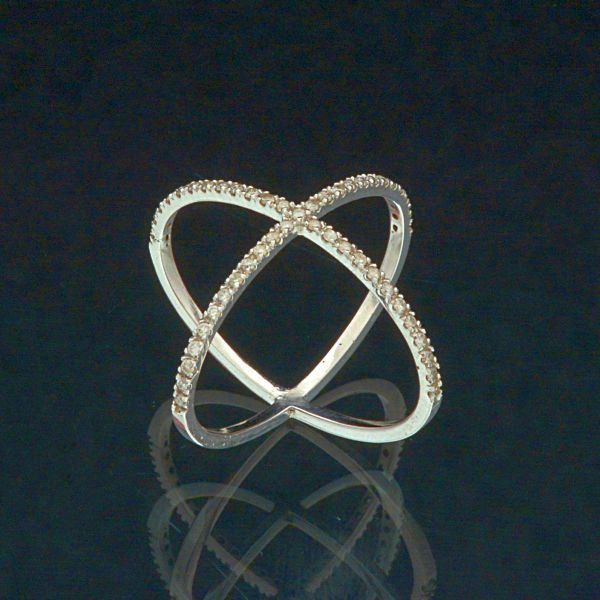 • <b>Anel </b>cruzado de diamantes em ouro branco 18k com 49 brilhantes. Peso total da peça 2,96 gramas.