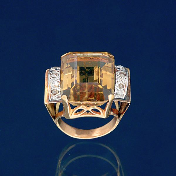 • <b>Anel </b>de citrino e pequenos brilhantes montado em ouro 18k. Peso da peça 9,67 gramas.