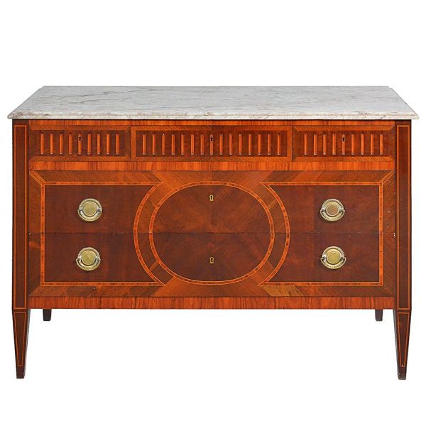 • Antiga <b>cômoda</b> no estilo francês construída em madeiras nobres europeias. Caixa retangular com três gavetas dispostas lado a lado, decoradas com frisos escavados e mais dois gavetões abaixo, decorados com filetes centralizando elemento esférico. Laterais também filetadas. Pernas retas afiladas para baixo. Puxadores metálicos e tampo em mármore rajado. Apresenta selo do fabricante no verso: "Móveis Cantinho do Céu" - João Ferreira de Lima. Med. 85 x 122 x 52 cm