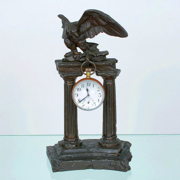 • <b>Relógio de mesa </b>em bronze, simulando ruínas clássicas com duas colunas caneladas sustentando um entablamento. Na parte superior, figura de águia alçada. Ao centro, pendurado sob o arco, relógio de bolso adaptado como mostrador, com numeração arábica e visor branco. Alt. 23 cm