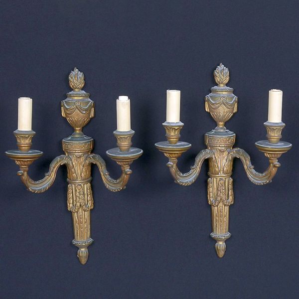 • <b>Par de apliques de parede</b>, em estilo neoclássico, executados em bronze dourado. Corpo central em forma de urna encimada por chama, ladeado por dois braços em voluta, ricamente ornados, sustentando "bobèches" e simulando velas. Alt. 45 cm
