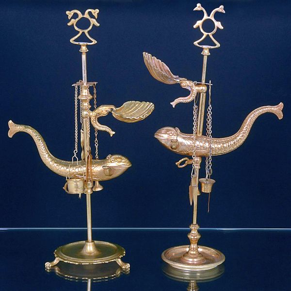 • <b>Conjunto de 2 antigos candeeiros </b>possivelmente franceses, Império, em bronze dourado. Decoração com motivos marinhos, altura regulável e um deles com pés em garras. As bases são ligeiramente diferentes. Séc. XIX. Alt. 47 cm