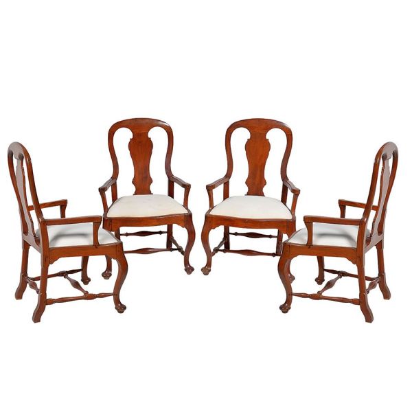 • <b>Conjunto de quatro cadeiras de braços </b>europeias, em madeira nobre. Estrutura movimentada com espaldar vazado. Pernas recurvadas unidas por travessões torneados e terminadas em sapatas. Assento forrado em tecido. Alt. 98 cm