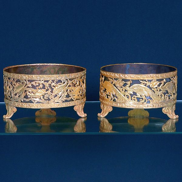 • Antigo <b>par de jardineiras </b>francesas Império, em bronze ormolu decorado com vazados de peixes e elementos vegetais. Triplos pés em volutas e recipiente interno em cobre. Alt. 12,5 cm; Diâm. 23 cm
