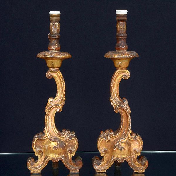 • <b>Par de "abatjours" </b>esculpidos em madeira, apresentando volutas, concheados e base tripartida em movimentos sinuosos. Fuste torneado na parte superior, onde se encontra o bocal. Alt. 57 cm
