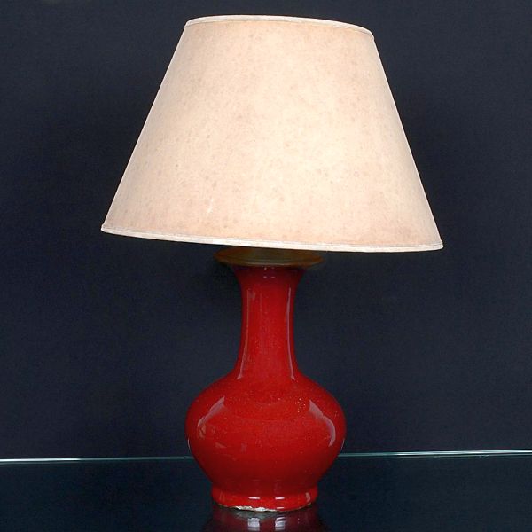 • <b>Vaso montado para "abatjour" </b>em bela porcelana chinesa coberta por esmalte "sangue de boi". Bocal em bronze. Porcelana do início do séc. XIX. Pequeno defeito na base. Alt. total 42 cm