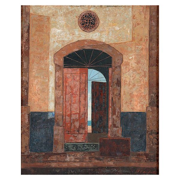 • <b>JOSÉ PAULO MOREIRA DA FONSECA </b><br>(1922-2004) <br>Sol em Casas Quentes<br>Óleo s/ tela<br>Ass. e datado 68, cid<br>Ass., titulado, situado e datado Rio 10.1.68, no verso<br>47 x 39 cm