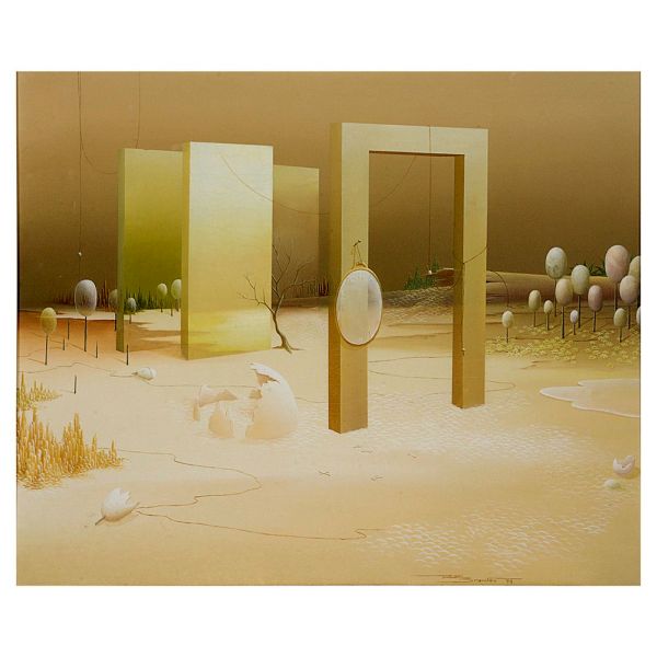 • <b>RONI BRANDÃO</b><BR>(1935-1991)<BR>Sem Título<BR>Óleo s/ tela<BR>Ass. e datado 79, no centro inferior<BR>Ass., situado e datado S. Paulo Brasil 01-1979, no verso<BR>50 x 60 cm