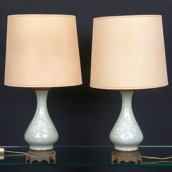 • Antigo <b>par de vasos </b>piriformes montados para "abatjours" em porcelana francesa "pâte-sur-pâte" celadon com flores em esmalte branco. Base em bronze. Alt. 65 cm