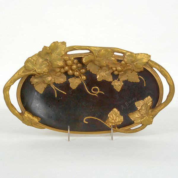 • <b>A. Bouny </b>- Belo e antigo "vide poche" francês em bronze patinado e dourado decorado com cachos de uvas e folhas de parreira. Ass. à direita. Compr. 37 cm