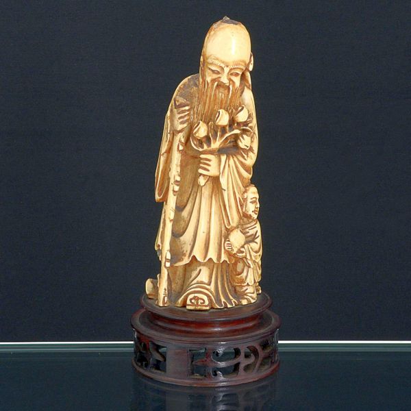 • <b>Estatueta </b>chinesa em marfim esculpido representando figura de ancião com criança. Ponta do cajado quebrada. Base em madeira. Alt. 19,5 cm