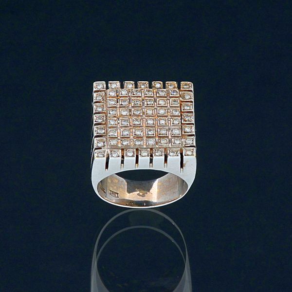 • <b>Anel </b>de diamantes "design" argolão com 60 pedras, em ouro branco 18k. Peso aproximado dos brilhantes 0,60 ct. Peso da peça 14,43 gramas.