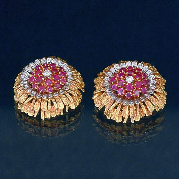 • <b>Par de brincos </b>de rubis e diamantes montados em ouro 18k com 36 rubis redondos e 27 diamantes lapidação 8/8 "single cut". Peso total dos brincos 29,92 gramas (2 "full brilliant cut" com 0,24 ct no centro dos brincos).
